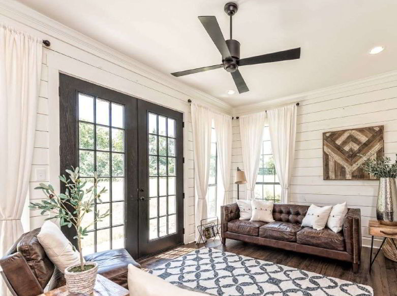 The color combination is wooden walls with white, while black is used on the door trim. Add rustic wooden wall decor that matches the color of sofa or floor from barndos. Put the black and whit rugs in the middle of the room.