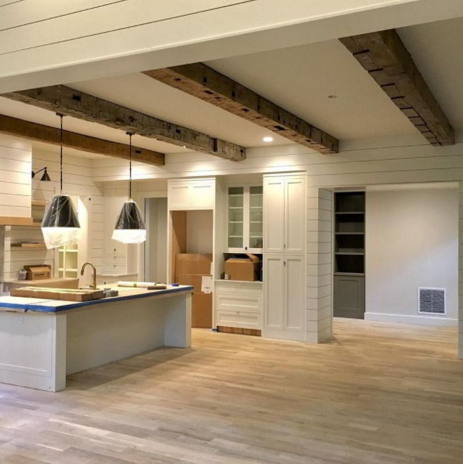 If you use white, make clear lines of separation between the wood for the walls. Add minimalist furniture such as black chandeliers, white counters, and floor decks.