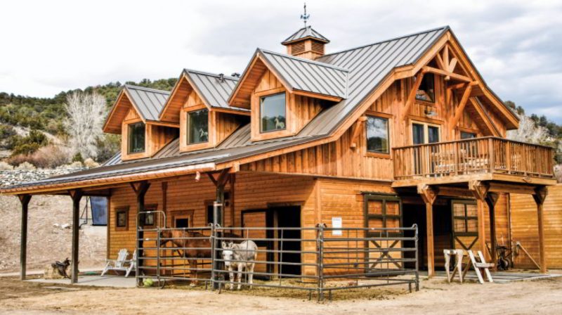 The exterior nuanceof the barndominium is enhanced by the polished wood color. This color is not only for the main part of the wall, but also for the supports, attics and railings.