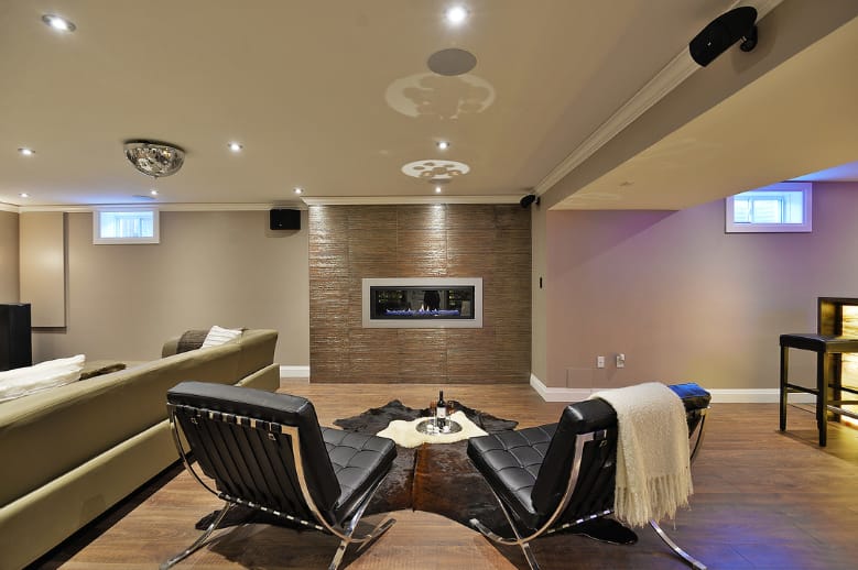 The next idea is for a modern basement with a minimalist interior. If you are going to place couches in the room, don’t let one of them block the fireplace.