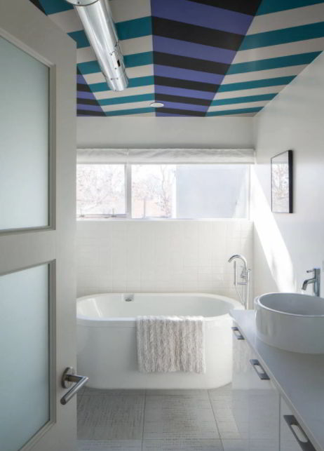 How about painting the ceiling with 3D patterns? This small bathroom adopts a modern look with white walls, pale gray floors, and artsy ceiling that appears contrast.