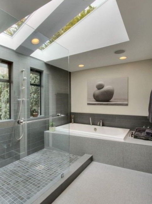 A sloped ceiling is always a good choice to make your bathroom visually higher. Painted in pale gray, the ceiling matches bathroom walls and floors that come with a similar tone.