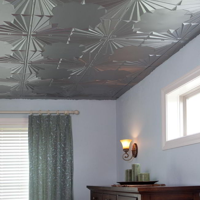 Patterned tiles for ceiling add textures to your bathroom. As one of the best bathroom ceiling ideas, it offers a visual interest with silver art deco touch.