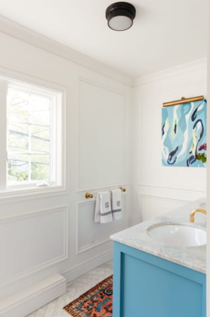 When it comes to trimming a white bathroom, you have two options to choose, they are trimming it in contrasted colored moldings or in white moldings. If you choose the latter, you can consider this wall molding idea.