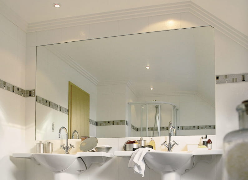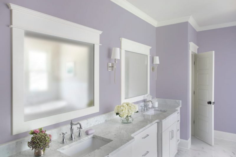 This light purple bathroom is a bit unusual, but it looks attractive with the combination of white moldings and large mirrors. The moldings used in this bathroom are quite simple. However, they are perfect for it because they balance the unusual bathroom color beautifully.