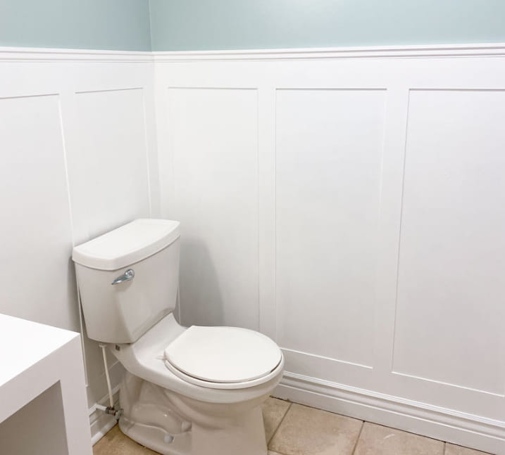 It takes black panel molding, black beadboard wainscoting, black chair rail, black baseboard, and black crown molding to create this look. This bathroom molding idea is best for the men’s bathroom.