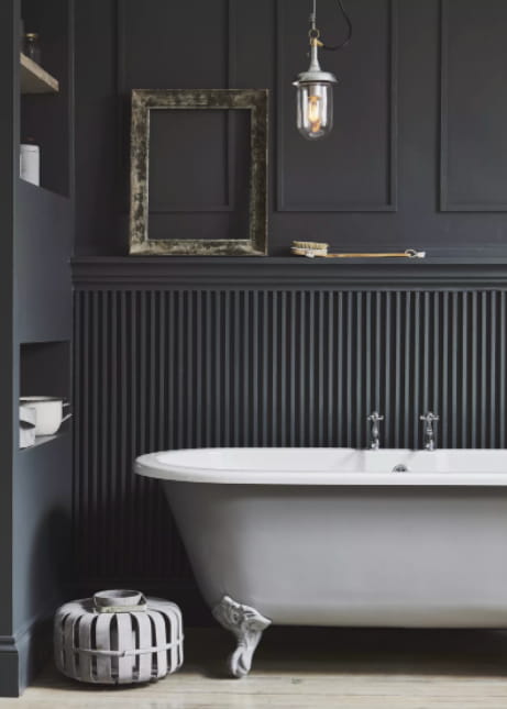 If you want to trim your bathroom in an extraordinary wall molding idea, you can try trimming it in black moldings. This is one of the most unusual bathroom molding ideas that will make your bathroom look impressive.