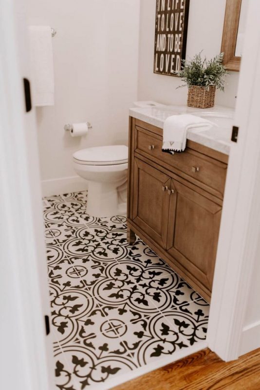 This patterned ceramic tile looks attractive and elegant. Its neutral color looks beautiful combined with the brown vanity and white wall. A patterned ceramic floor is not only attractive. But, it is also pretty easy to maintain and durable.