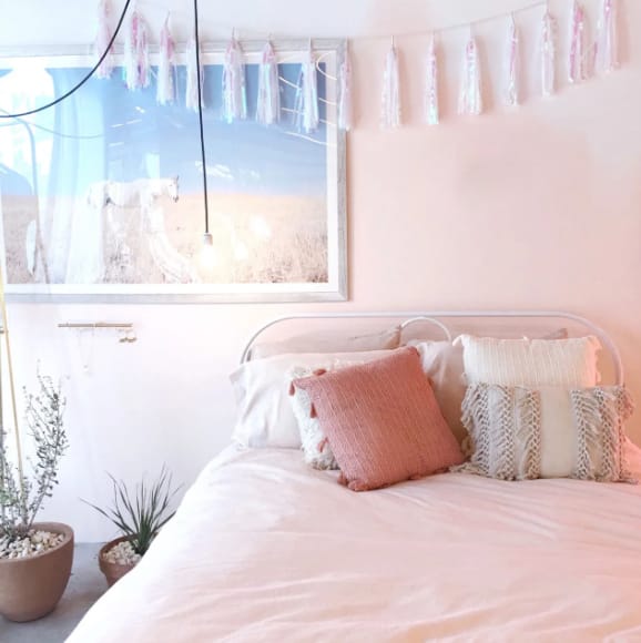 A headboard is a popular element in the bedroom. You can add a headboard even though the main frame of your bed doesn’t have any. Choosing the headboard with iridescent colors will create a better interior since it shines during the day like a rainbow.