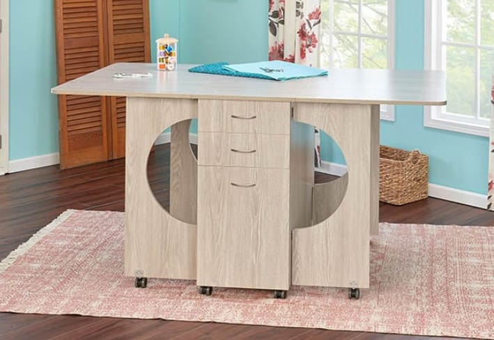 The first best cutting table is from Sew Ready Studio Designs. The professional cutting table comes with storage drawers.