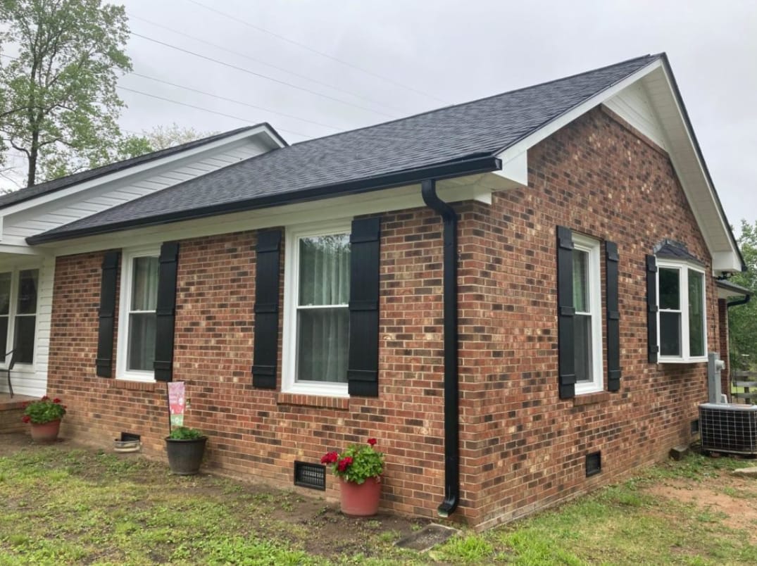 Brick House with Black Window Shutters and Gutters