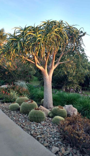 To create a desert theme backyard, frame your tree with some cacti on the ground. Those plants don’t need water so they can grow easily with your big tree.