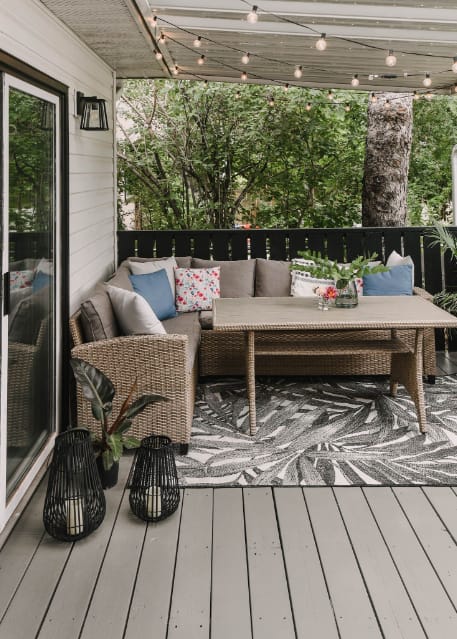 An area rug outfits the outdoor patio with a cozy and welcoming ambiance. Use living plants to add a natural look.