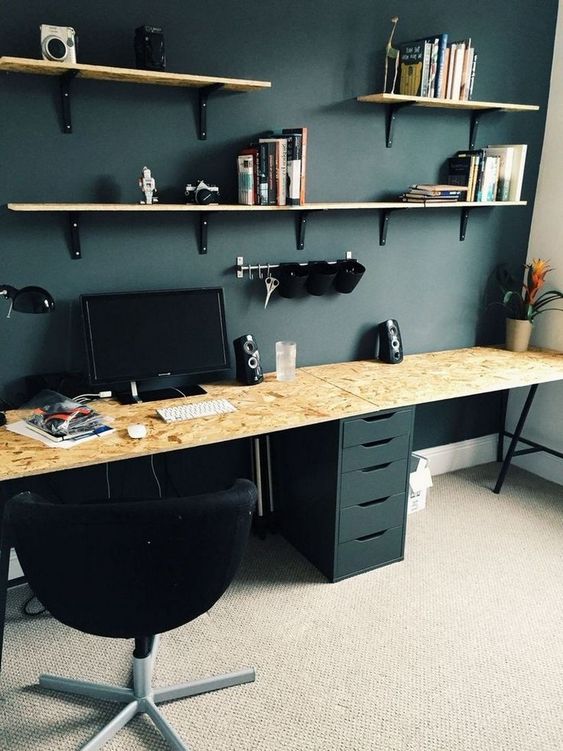 If you plan to build an extended computer desk but need to minimize the use of pipe, employ a file cabinet to support the top. Added with floating shelves, your home office looks more stylish and functional.