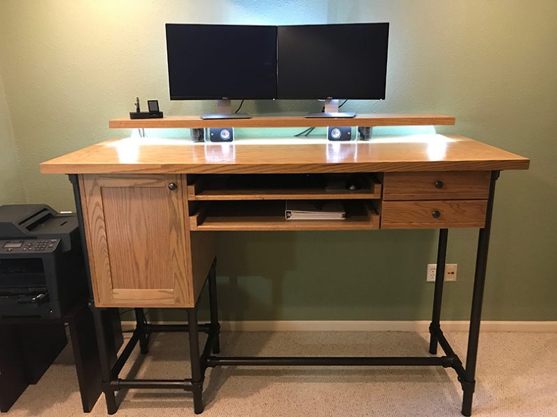 The standing pipe desk has extra compartments and drawers to keep everything in place.