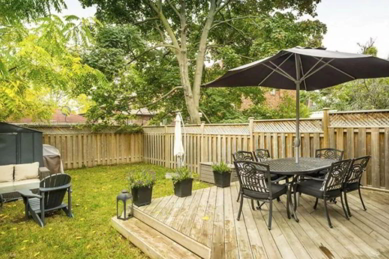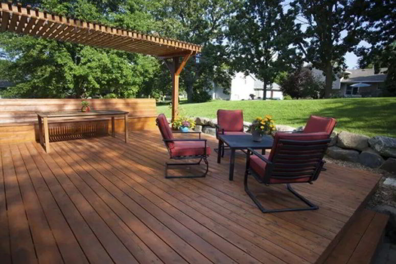 Decks can connect to the house or separate parts of the yard. On top of the deck, there is also furniture such as a dinning set made of polished wood.