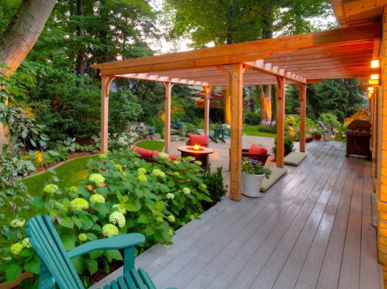 On top of the bench there is a pergola with a neatly shaped slate. This deck is perfect for building in a large backyard. You can add a few small plants on the edges to make it look greener.
