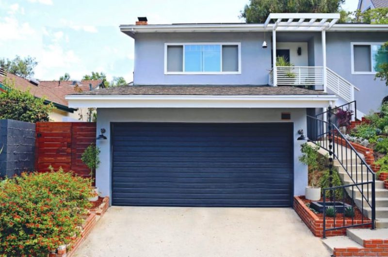 The next on our garage door ideas list is to go with blue. What color goes well with light blue? Well, a lot, but navy blue looks incredibly good.
