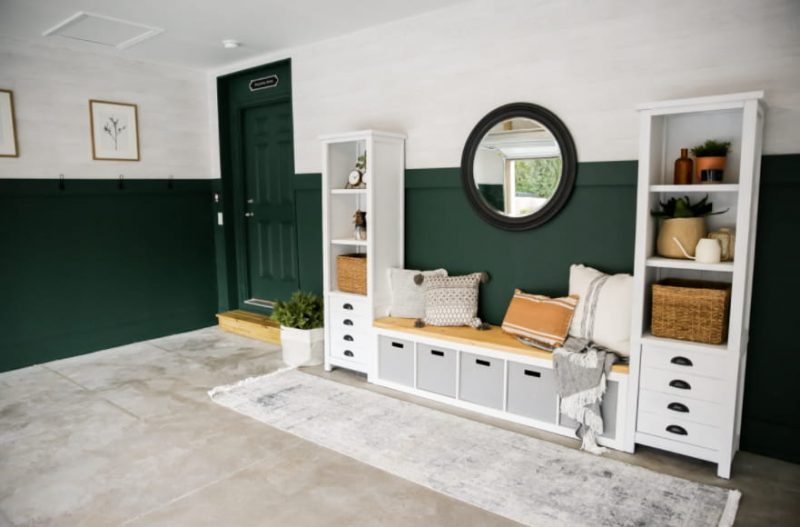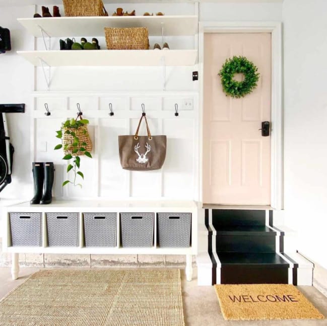 If you prefer to go simple, this mudroom idea should be on the top of your list. It transforms one of your garage corners into a simple, chic, and fully equipped mudroom.