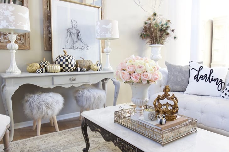 Moreover, it has glamorous decorations, such as fur short stools, antique furniture, flowers, and tufted sofas. Therefore, these decorations and furniture create a boho-chic and glamorous look in this living room.