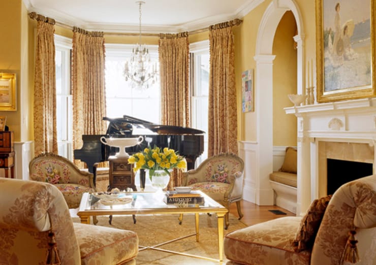 A combination of a grand piano, classic furniture, a long drape, a chandelier, and a large painting can create a glam living room. This beautiful living room will surely mesmerize your guests.
