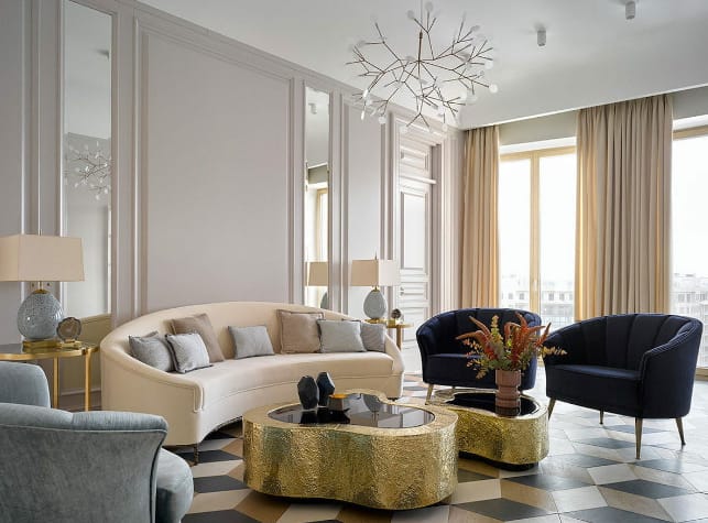 Clean-line furniture dominates this room. However, glam living room characteristics are also present in it. Some of these characteristics are gold finish on furniture, mirrors, long drapes, and a sizeable lighting fixture.