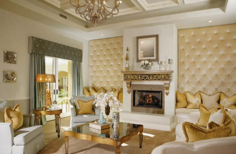 Some homeowners use gold-colored-decoration sparingly when remodeling their living room with glam living room ideas. However, it is not so with the owner of this living room. He chooses to use lots of gold color in his living room décor.
