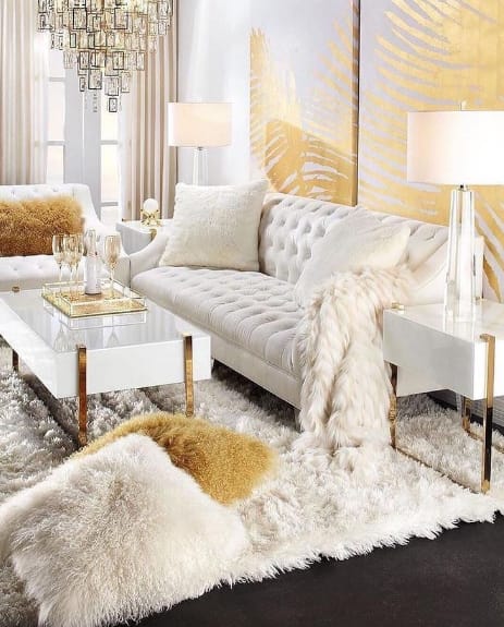 Glam living rooms generally have a neutral color as their basic color and a touch of gold, pink, or other colors. The living room in this picture, for example, combines white and gold.