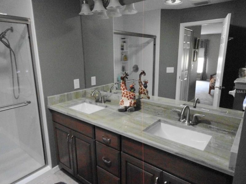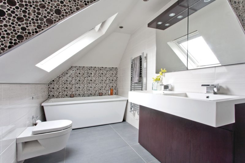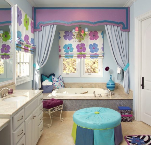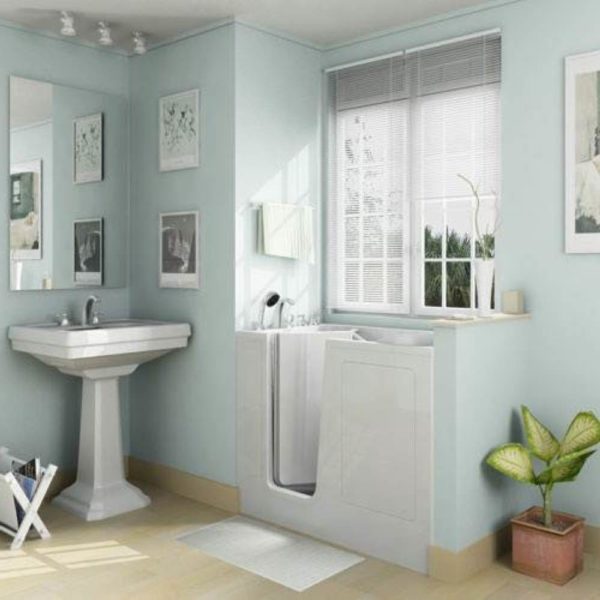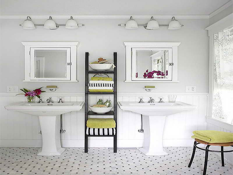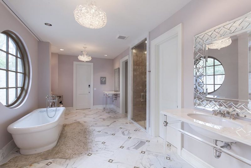 The first idea is designed for you who are looking for a soft and traditional look for a bathroom. The designer of this bathroom chose a pale grey as the main shade. It looks flawless and clean. There are some other colors that accentuate the room.