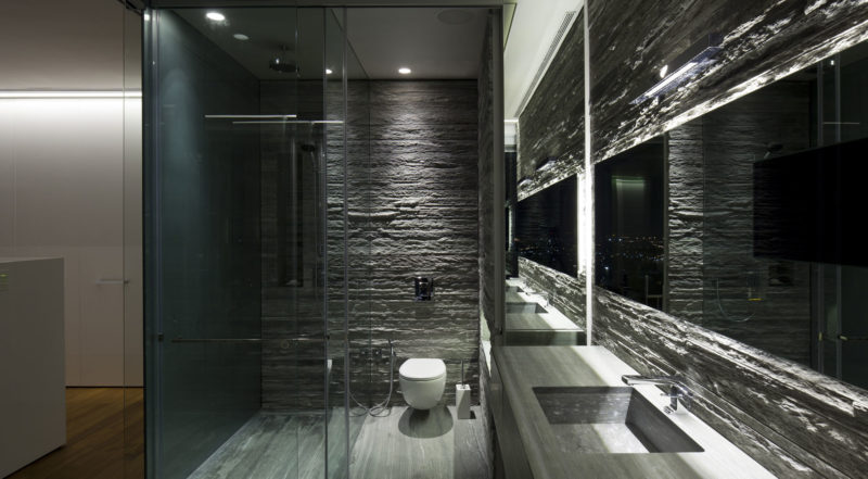 The reflective mirror shines the grey lines better. As you can see, there’s a round wall light fixture on the wall beside the mirror. That really helps the ambiance to be softer.
