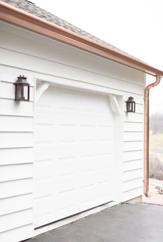 Copper gutters look standout on a white house. The color of the coppers creates a bold contrast with the white walls and the roof. If you are bored with plain white exterior, installing copper gutters will refresh the visual appearance for enhanced curb appeal.