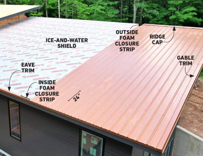 After installing the corrugated metal roofing, you can finish the project by installing flashing. It should be installed in several crucial areas like ridge, eaves, and between the roof and the wall. Flashing helps prevent water from penetrating into the seams and joints in your roof.
