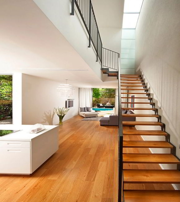 Wire banister and its see-through design looks invisible so people will think your house is wider than it really is. Besides, consider having floating steps.