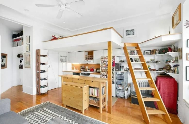 This idea comes from a super tiny house with an extra low ceiling. If you are trying to build the same house, then pick some low sofas for the living space under the loft bed. Place a low bed on the loft so there will be enough space for you to sleep comfortably on it.