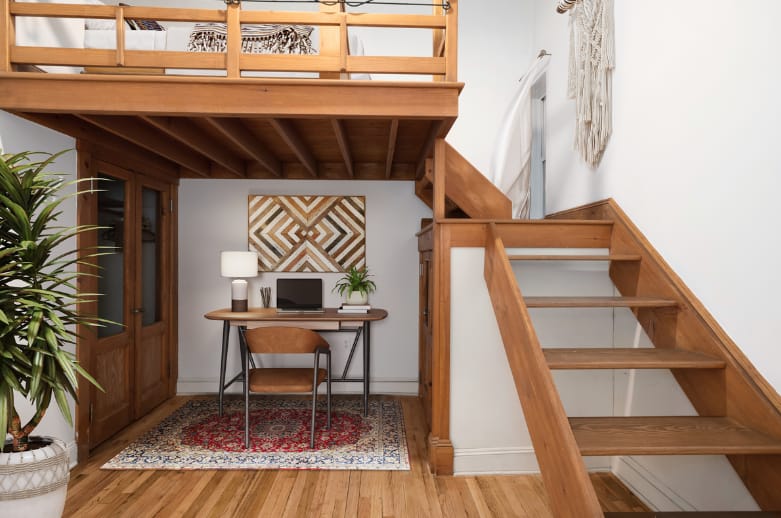 Use wooden furniture for the home office to match the wooden stairs to access the bedroom area on the loft.