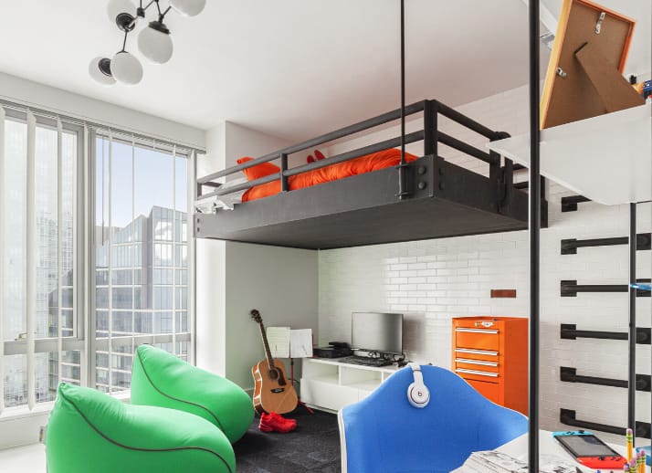 Adding a small window on the loft bed is essential so that the bed area won’t be too dark. Pick the same color for your bed and the sofa.