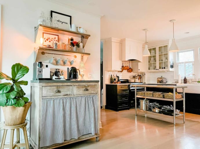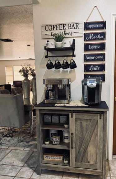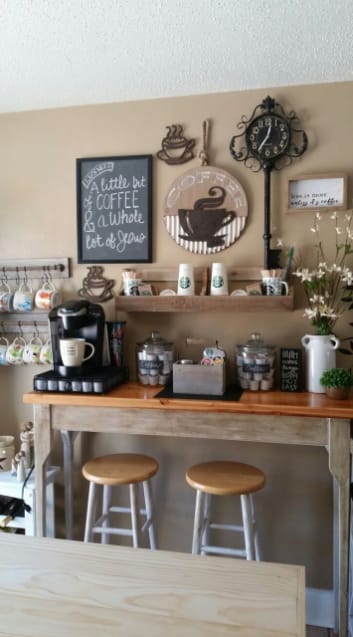 Modern farmhouse coffee bar ideas are fairly popular among coffee lovers because they are eye-catching. The bar above is an example of an eye-catching farmhouse coffee bar.