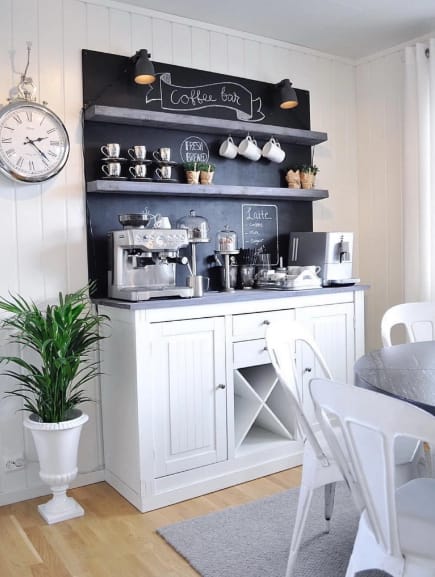 You can see how attractive these ideas are from the picture above. This coffee bar looks eye-catching thanks to the black chalkboard backsplash and white cabinets.