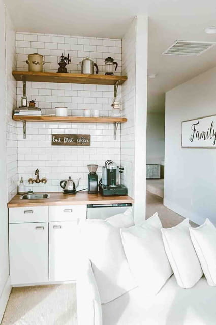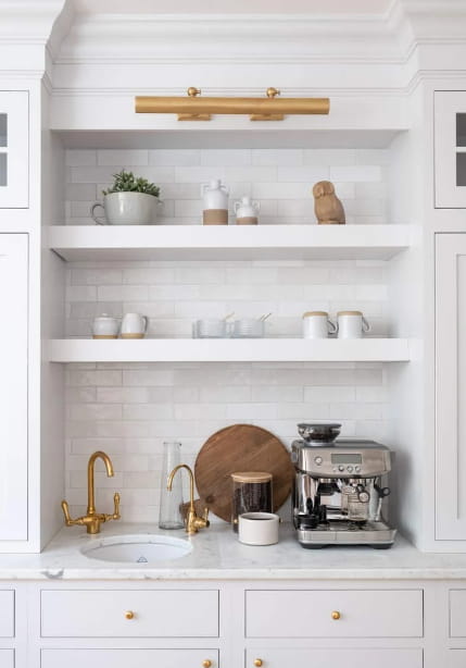 To create it, you only need to place mugs, jars, some decorations, and a coffee machine on the shelves and countertop. However, you can skip the sink if your coffee bar is near the kitchen.