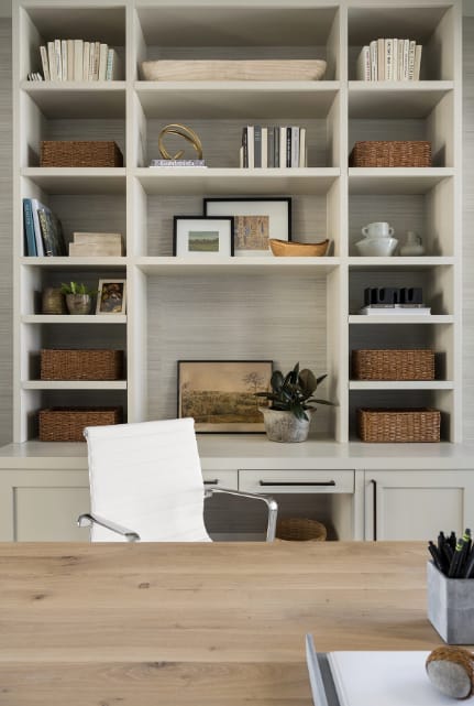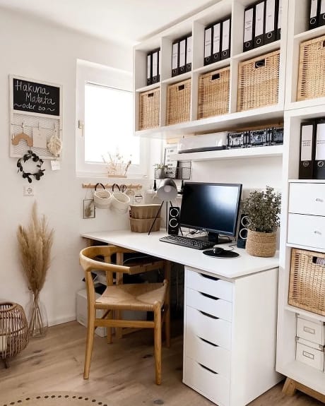 The home office above presents a shelving idea that promotes an attractive balanced item arrangement. The shelves in this office also offer excellent functionality because it has many storage options. Moreover, they make the room organized thanks to the wicker baskets.