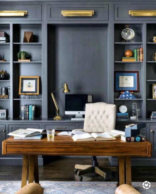 The dark home office shelving idea above is perfect for you who want to add a masculine vibe to your home office. These built-in shelves are large. Therefore, they offer many spaces for storing your home-office-related items.