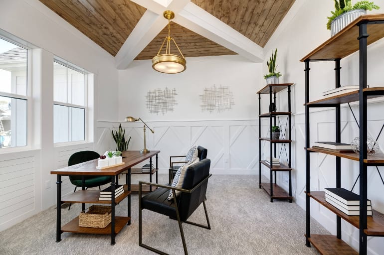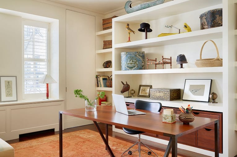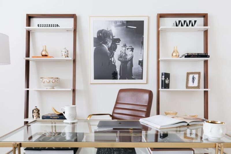 White modern office shelving is common in modern home offices. However, you can make these shelves eye-catching by placing unique decorative items on them. Several items you can use to decorate these shelves are antique boxes, a wicker basket, and hats.