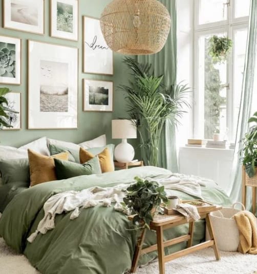 Boho chic can be applied in sage green bedrooms since this style is more into appliances and decoration in the space. The vibe comes from the hanging lamp and other stuff such as the paintings, wallpapers, rugs, and the dresser.