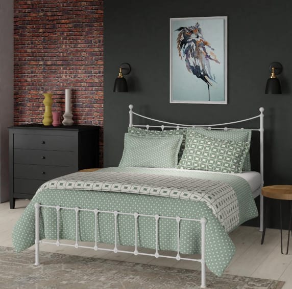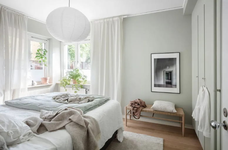 The light sage green is a good choice because it will give a vibrant atmosphere to the bedroom. You can apply the color on the wall, bed sheet, and wardrobe.