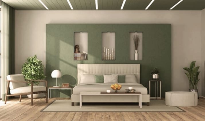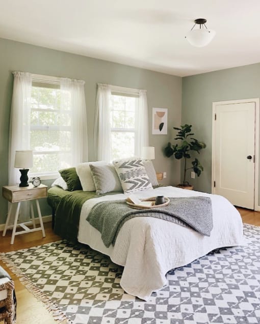 The main sage green color is for the wall and the pattern of bed sheets and rugs. This combination suits the preference of a person who doesn’t like bold colors in the bedroom.