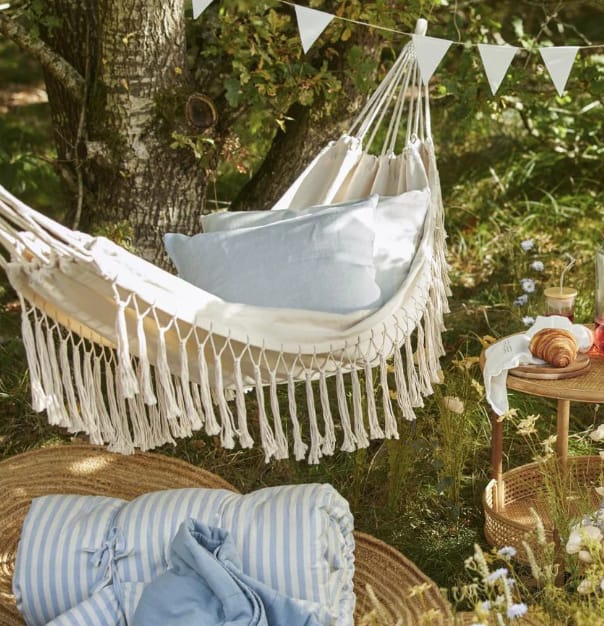 Hammocks can be decorated with colorful pillows or blankets to inject a pop of color and texture into your outdoor living space. However, overdoing this task could lead to a boho chic or bohemian style. So watch out for every element you put in.
