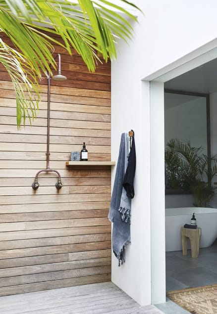An outdoor shower can be designed to blend in with the natural surroundings, creating a serene and peaceful atmosphere. It can be decorated with plants, pebbles, or other natural elements to create a spa-like experience in your backyard.