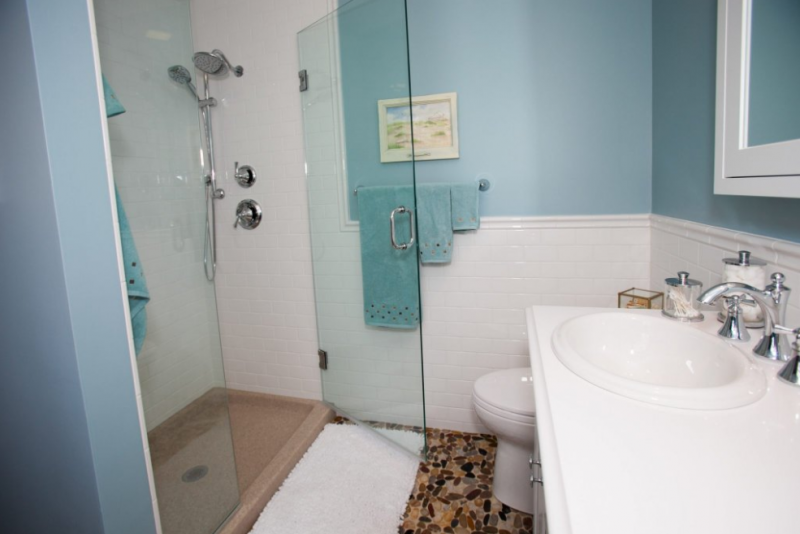 Tan shower floor entirely mimics the beach sand. On the other side, you will step on colorful pebble floor. Frameless glass doors make you completely feel relaxed. And the hanging painting always reminds you of laid-back and fun atmosphere.