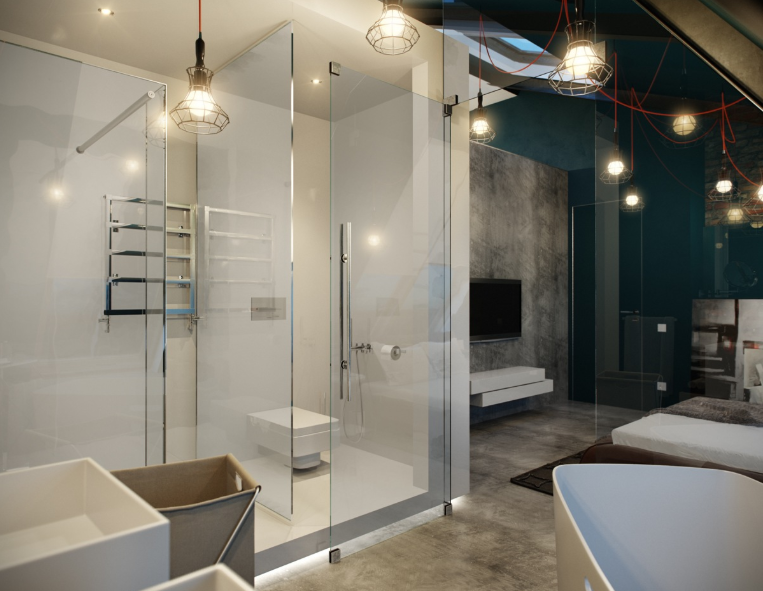 Additionally, it has captivating glass doors. To illuminate this factory-like bathing space, vintage industrial pendant lights are suspended on the ceiling. Here, you quickly could notice exposed red wires as well.