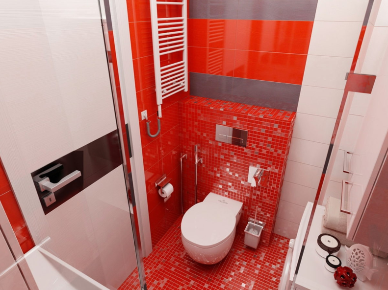 Candy apple red mosaic tiles are used for floor and toilet backsplash. Moreover, they give nice contrast to the white tiled-wall, door and cabinet. The final outcome seriously couldn’t be more alluring.